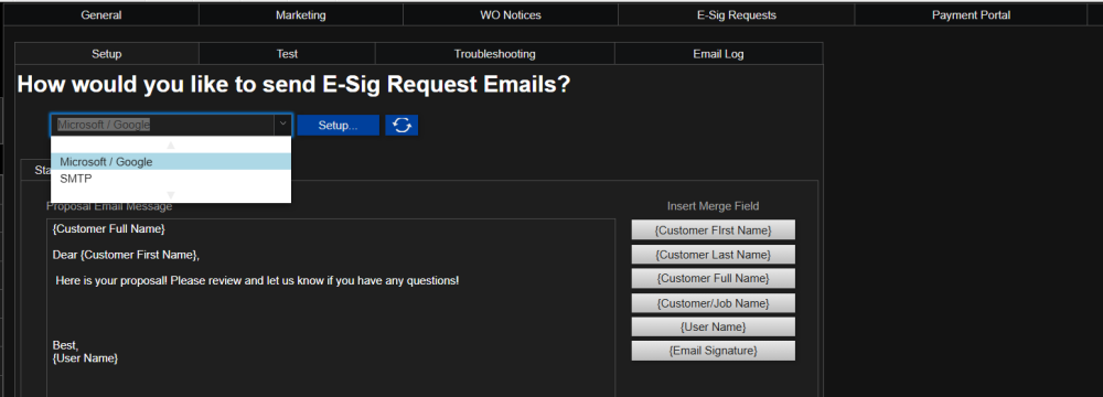 We’ve made some updates to Web Services so that in lieu of SMTP, you can use Oauth2 to utilize Google or Microsoft. In Settings>Web Services WO Notices, E-Sig Requests, and Payment Portal you can opt to use Oauth2! Simply select Google/Microsoft from the dropdown and click Set Up. Don’t worry, if you want to continue to use SMTP those settings are still available to you as well.