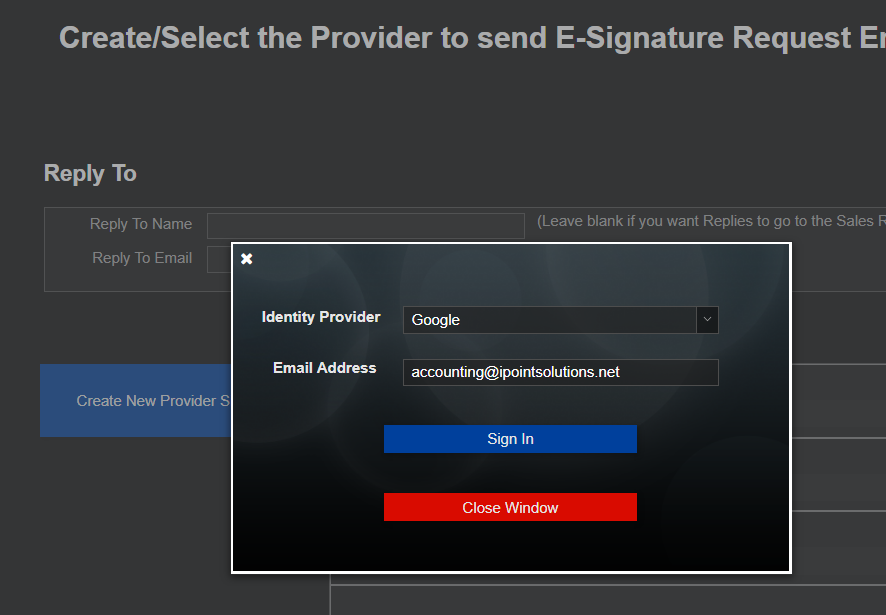 Then click to Create New Provider Sign In. From there you are prompted to identify the provider from the drop down, and add an email address; then, click sign. You’ll be prompted to enter the password for this account.